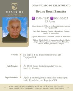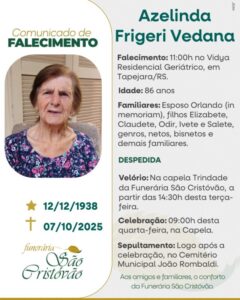 NOTA DE FALECIMENTO Nota de Falecimento: JOSÉ IVALINO BIAZUS Nova FM 2 de maio de 2024 A Bianchi Funerárias, juntamente com a família Biazus, comunica com pesar, o falecimento de José Ivalino Biazus, ocorrido às 17 horas do dia 01/05/2024 no Hospital de Clínicas em Passo Fundo com 69 anos de idade. Seu corpo está sendo velado na Capela 1 da Bianchi Funerárias. Celebração na tarde do dia 02/05/2024 com horário a ser definido e após seu sepultamento no Cemitério Municipal João Rombaldi Continue Reading Previous Nota de falecimento: Terezinha Teixeira PegoraroNext Nota de falecimento: Florentina Libera Crestani Mais notícias GERAL NOTA DE FALECIMENTO Nota de falecimento: Azelinda Frigeri Vedana Nova FM 7 de outubro de 2025 GERAL NOTA DE FALECIMENTO Nota de Falecimento: Bruno Rossi Zanatta Nova FM 6 de outubro de 2025 GERAL NOTA DE FALECIMENTO Nota de falecimento: Candida Caroff Viana Nova FM 5 de outubro de 2025
