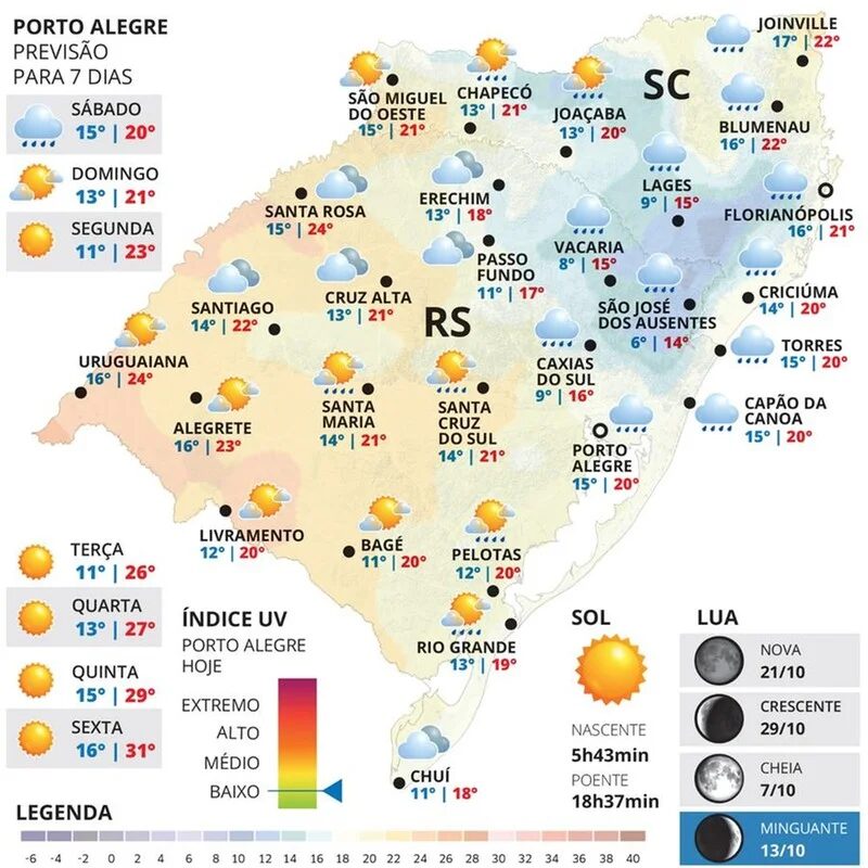 O sábado, 18, terá céu com muitas nuvens e chuva irregular em algumas regiões, especialmente na Metade Norte, entre os Vales, a Serra, a Grande Porto Alegre e o Litoral Norte.
