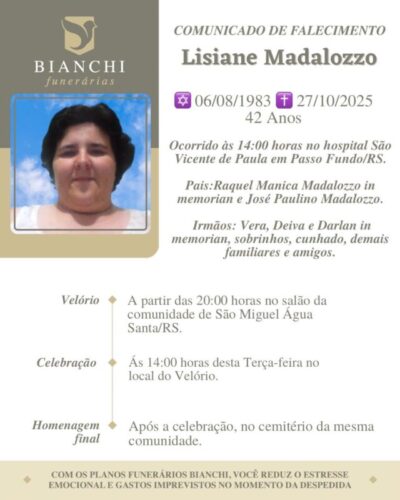 A Bianchi Funerárias, juntamente com a família Madalozzo, comunica com pesar, o falecimento de Lisiane Madalozzo, ocorrido às 14 horas do dia 27/10/2025 no Hospital de Clínicas em Passo Fundo com 42 anos de idade. Seu corpo está sendo velado no Salão da Capela de São Miguel Água Santa. Celebração às 14 horas do dia 28/10/2025 e após seu sepultamento no Cemitério da mesma Comunidade.